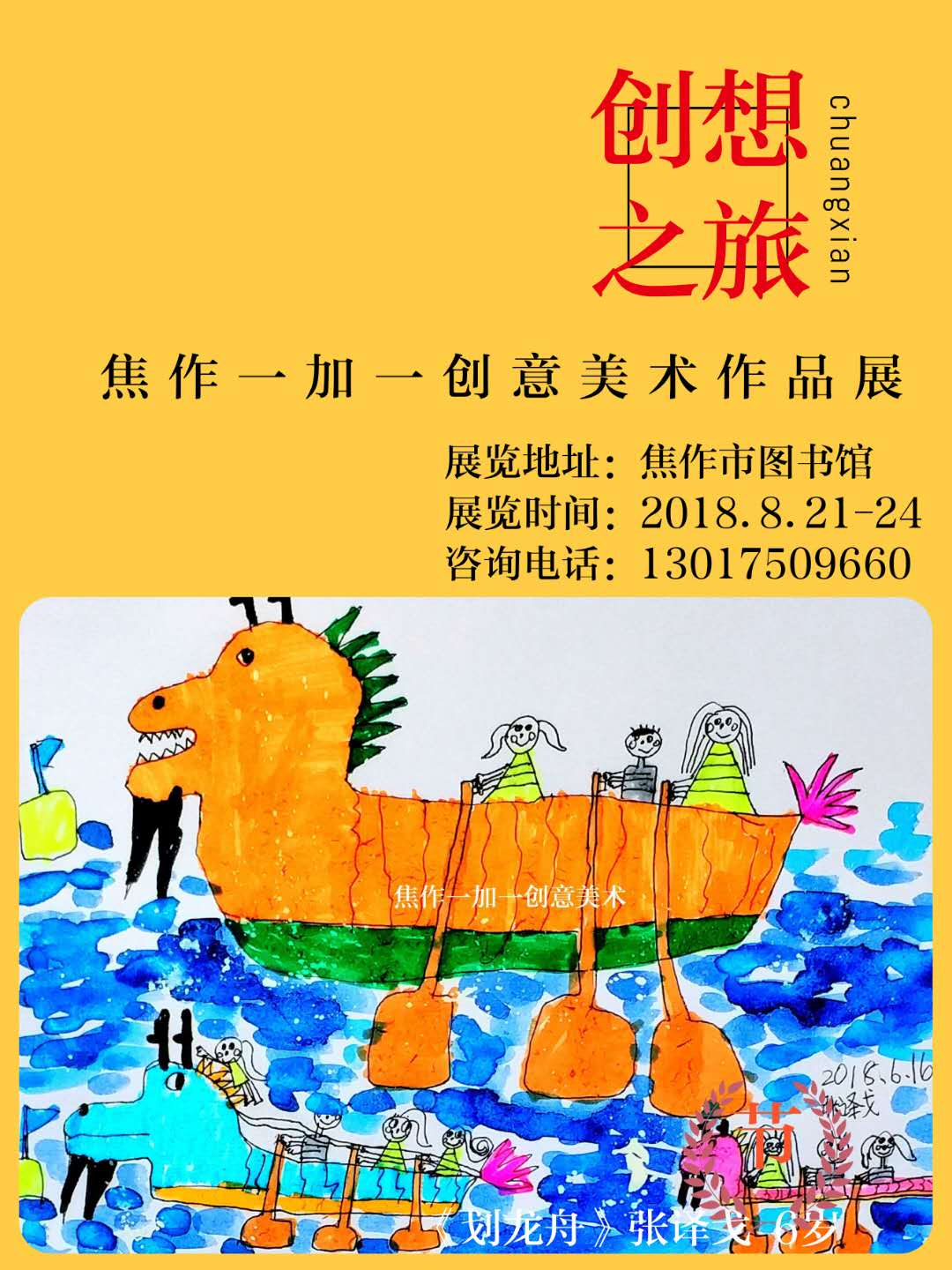 《创想之旅》--焦作一加一创意美术作品展 展览地址:焦作图书馆 展览时间:8.21——24 咨询电话:13017509660
