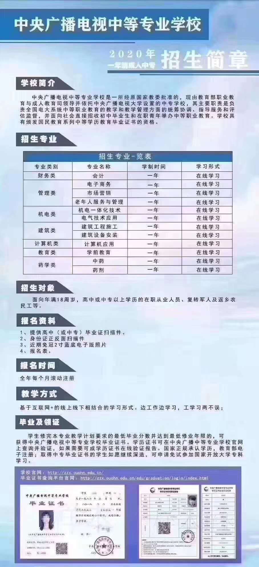 中央广播电视中等专业学校,专业多,好毕业, 一年拿证,国内不限户籍,不限地域,官方网站可查! 18周岁以上均可报名 从业需要,当兵需要,考大专需要… 报名资料:身份证正反面照片,蓝底照片电子版两寸 报名电话: ...