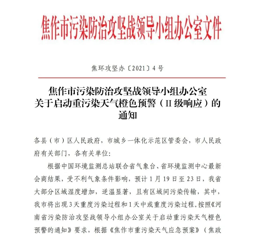 今天12时,我市启动重污染天气橙色(Ⅱ级)预警,将采取工业源减排、移动源减排、扬尘源污染控制等措施加以应对,预警解除时间另行通知。
