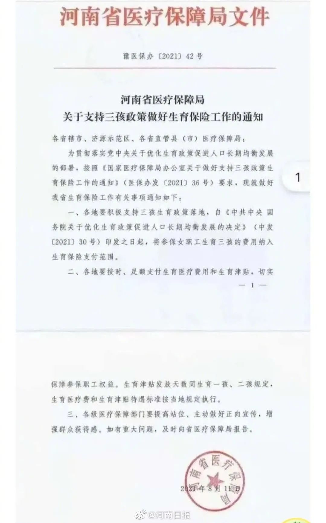 8月26日,记者从河南省医疗保障局获悉,日前,河南省医疗保障局发布了《关于支持三孩政策做好生育保险工作的通知》,其中明确规定,河南省各地市应按照《国家医疗保障局办公室关于做好支持三孩政策生育保险工作的通 ...