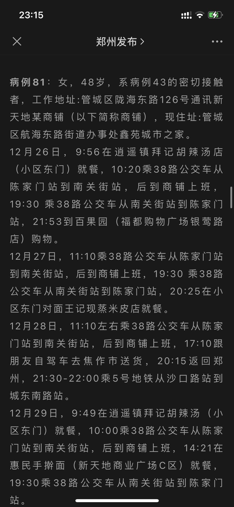 据郑州发布,郑州81号确诊病例曾于12月28日17:10跟朋友自驾车去焦作市送货,20:15返回郑州(白色背景图片);此后郑州发布又修改推送内容,增加了该病例1月2日上午该病例也曾到过焦作的内容(黑色背景图片)。 目 ...