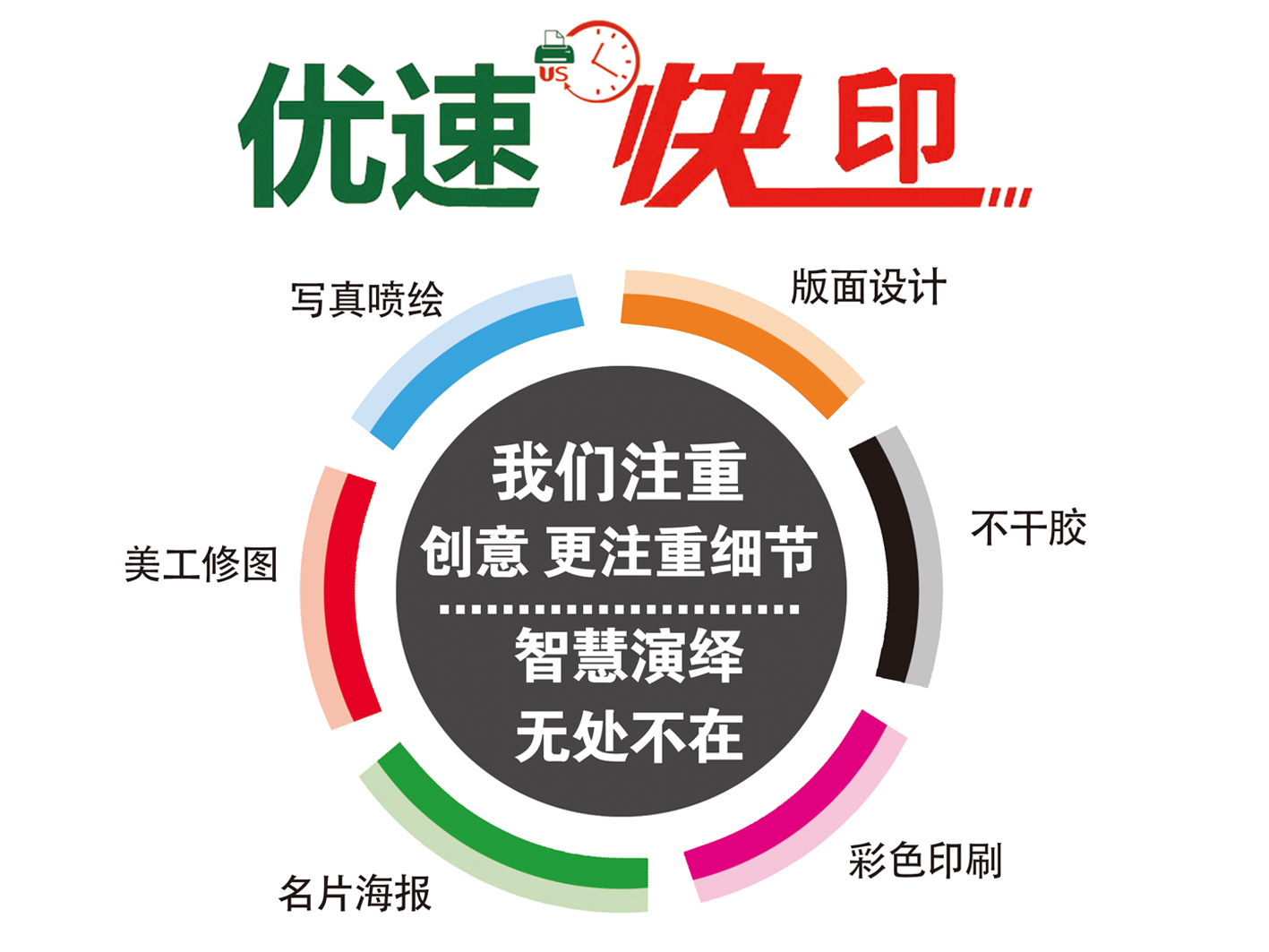 优速图文快印专业设计业务内容: 写真喷绘、美工修图、名片海报、培训资料、学习资料、公司画册、宣传资料、资料装订,彩色复印机高精度效果输出 彩色印刷、不干胶、版面设计等 |