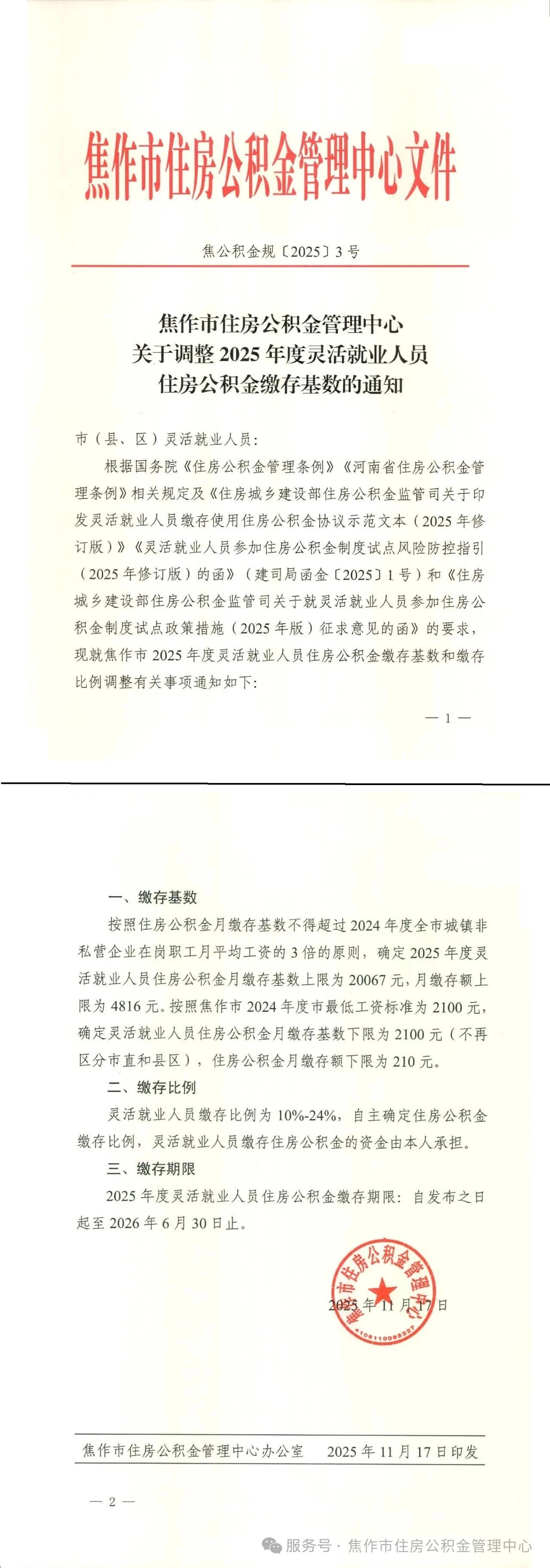 关于调整2025年度灵活就业人员住房公积金缴存基数的通知 ...