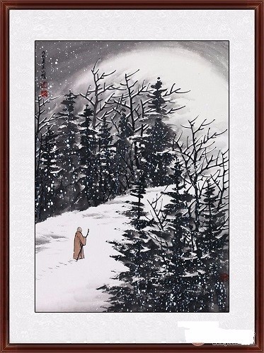 一个偶然的机会,五台山主持看到了吴大恺老师的一幅雪韵水墨山水画,两人进行了一番沟通交流,听主持一席话吴大恺仿佛醍醐灌顶,受到了很大启发。之后,他潜心创作研究,参禅作画,将禅意融入到雪景画中。经过多年锻炼,如今他画起雪景画来游刃有余,将冰雪世界中的禅境表现得一览无遗,进他的画室也能感受到禅的芳香。