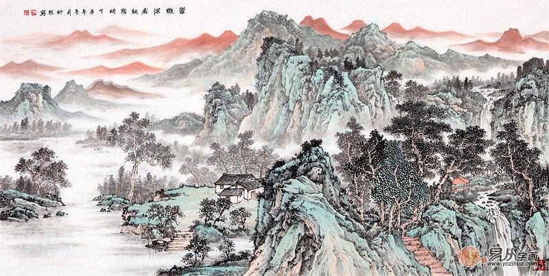 何新起写意新品青绿山水画《翠微深处朝阳明》【作品来源:易从网】