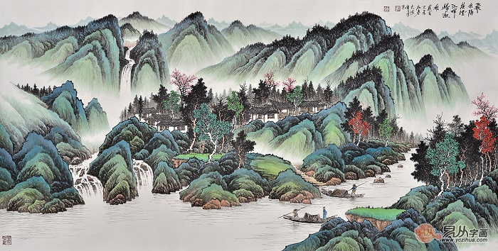 中国美术学会吴大恺青绿山水画作品《归舟图》【作品来源:易从网】