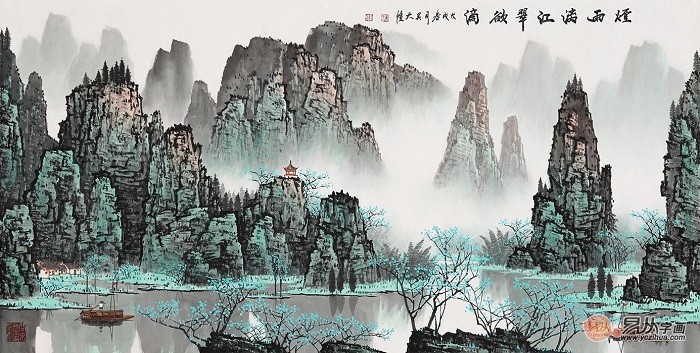 吴大恺最新创作漓江山水画《烟雨漓江翠欲滴》