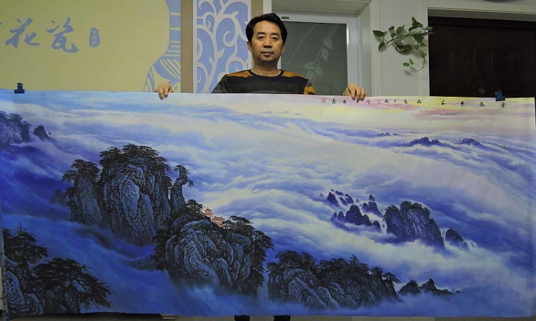 这幅画画的是高山之巅俯首云层时看到的景象,漫无边际的云,如临于大海之滨,波起峰涌,浪花飞溅,惊涛拍岸。当云海上升到一定高度时,远近山峦,在云海中出没无常,宛若大海中的无数岛屿,时隐时现于“波涛”之上。赵洪霞先生对云层上下细节处理十分到位,在情感相通的基础上,更有了各顺其势的“师道自然”之韵致。这一幅实在是令人惊叹的云海佳作,收藏鉴赏之上选。