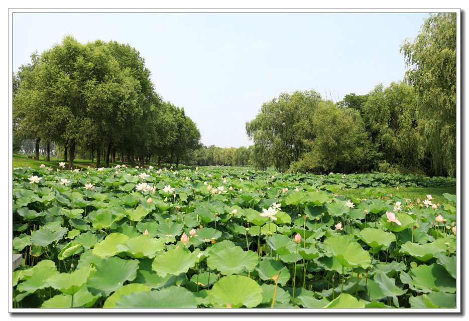无畏三伏热浪劲,彩莲依旧迎日开。碧叶层层迎骑者,心中一片凉自来。