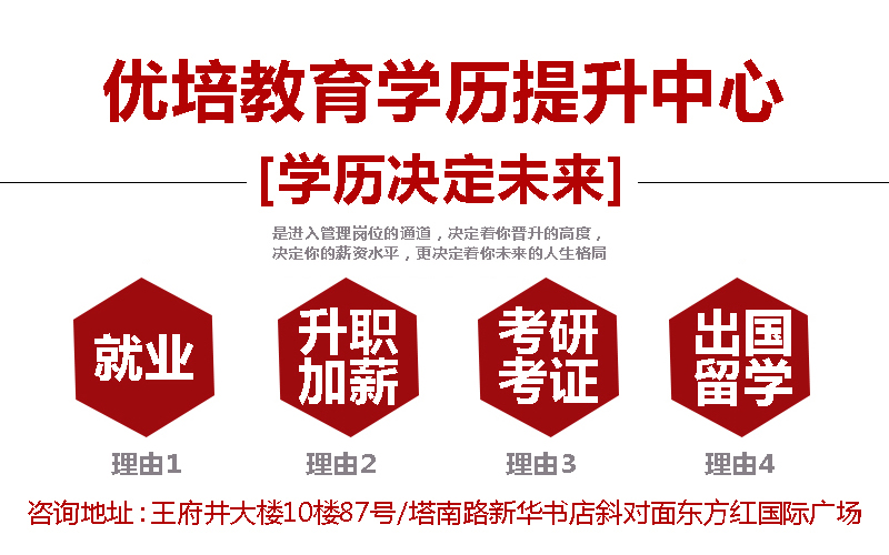 优培教育学历提升暑假班、寒假班、白班、晚班、双休日班、一对一自定时间班,家教班、常年招生,随到随学。 上课时间灵活,上课形式灵活,高效速成,让你用较短的时间掌握你要的技能,完全可以根据你的企业和个人的情况进行定制学习,让学习更高效快速。 1、人民路王府井10楼87号 2、塔南路新华书店斜对面东方红国际广场 |