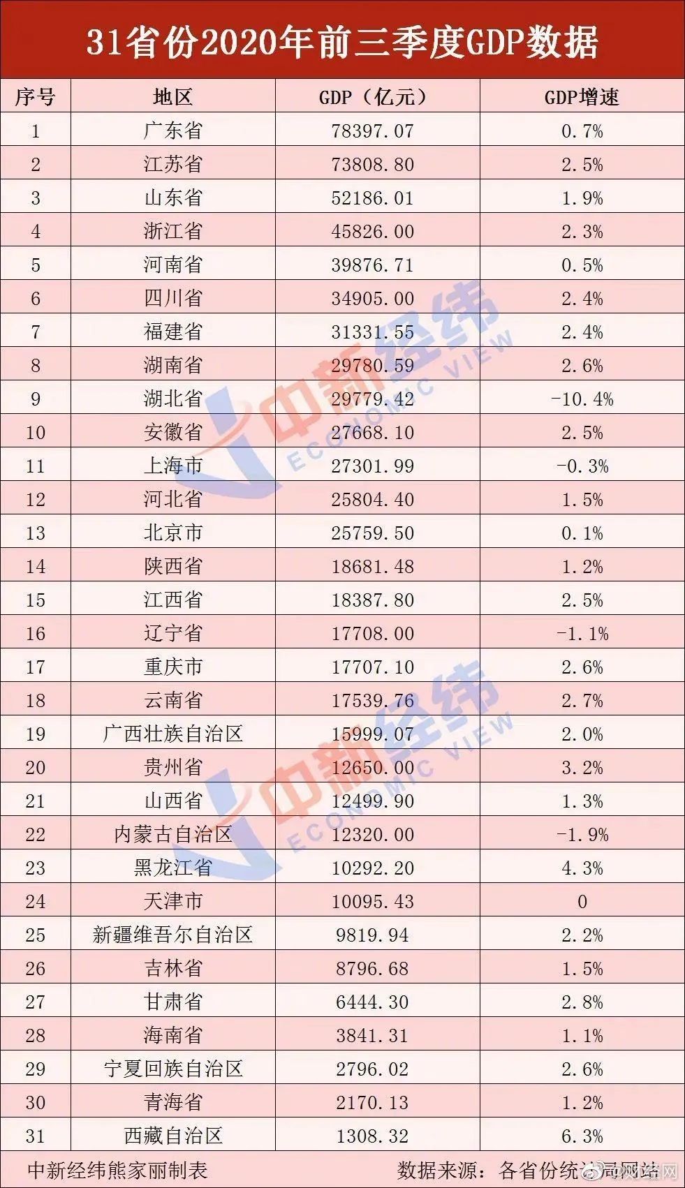河南省2020年前三季度GDP表现一般,增速只有0.5%,在前五省最低。广东、江苏、山东三省份的GDP总量排名与上半年相同,名列前三。浙江位居第四。河南、四川、福建3省份前三季度GDP总量超3万亿元,湖南、湖北、安徽、 ...