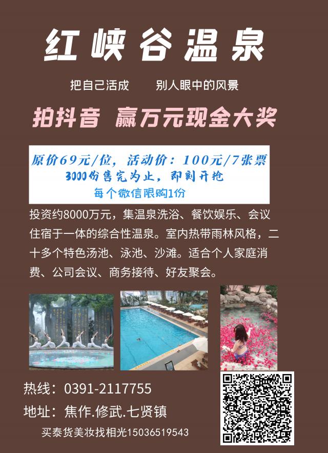 云台山红峡谷温泉特惠票100元7张,限量3000份(周末、寒暑假加10元,元旦、春节、五一假期每张加20),有效期到2021年7月31日,微信扫描下图海报识别图中二维码即可购买。 二、活动福利:扫描识别后点击页面右下角 ...