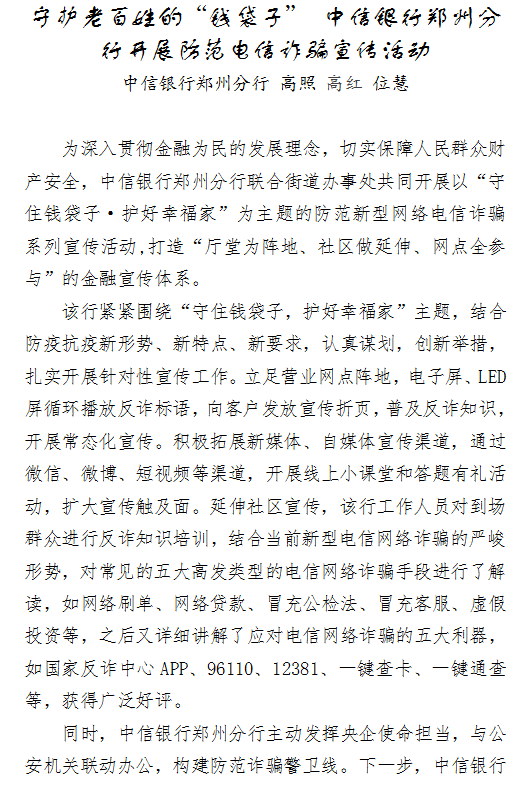 守护老百姓的“钱袋子” 中信银行郑州分行开展防范电信 ...